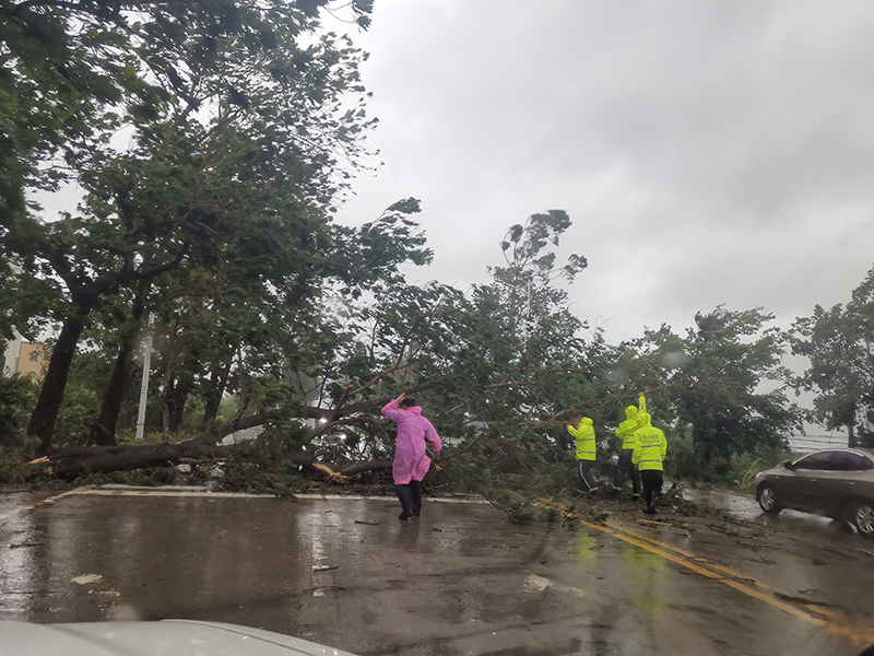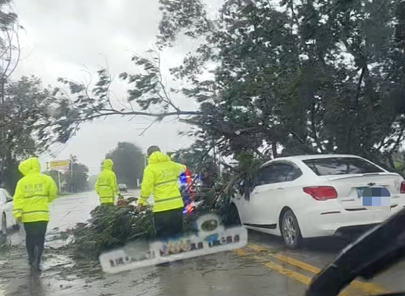 随后,民辅警与道安办抢险人员展开路障清理工作,操作专业设备对倒伏大树进行切割、分段搬运,在狂风暴雨中作业。经紧急处置,倒伏路面的大树很快被清走,受阻的水林路恢复了畅通。