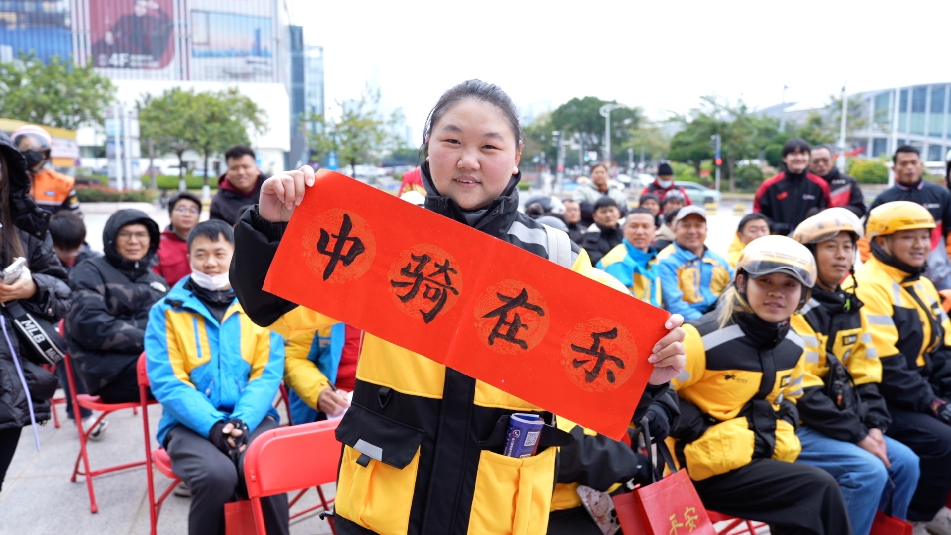 “马不停蹄接单顺”的定制上联一经抛出,骑手们争相举手、踊跃抢答,“人勤春早收获丰”“骑手飒爽喜气浓”等贴合配送员职业身份的巧思下联接连脱口而出,字里行间藏着对跑单的期许、对平安的祈愿。书法家现场挥毫,一个个饱满的“福”字、一副副寓意吉祥的春联,将传统年味与新春祝福凝结在笔墨之间,被骑手们小心翼翼接过,视作这份新春礼遇里最珍贵的礼物。